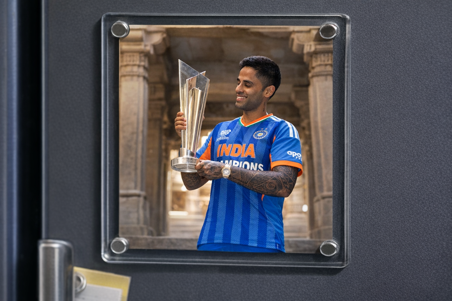 Acrylic material fridge magnet. Based on Cricket T20 WC 2026 Winning Team India photos.