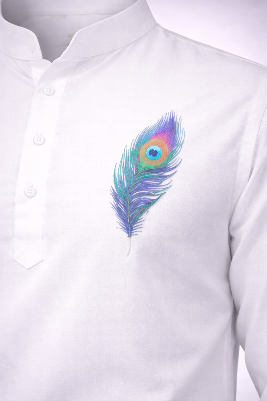 The highlight of this white kurta with peacock feather is its vibrant and artistic feather print on the chest. It adds a unique and sophisticated touch to your ethnic look.